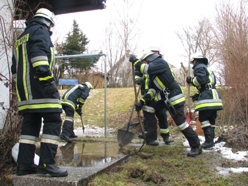 Die Feuerwehrmänner richteten das abfließende Wasser mit Hilfe von Sandsäcken und Gräben vom Haus weg. Der so entstehende “Bach” wurde mit Schaufel und Pickel in Richtung Kanal geleitet. So konnte weiterer Schaden verhindert werden.