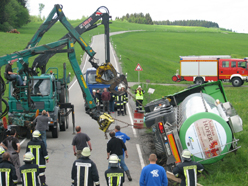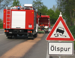 Daraufhin rückten ein paar Männer der Wehr mit zwei Fahrzeugen aus und banden die Ölspur ab. Sie zog sich von der Frühlingsstraße bis ca. 200 Meter nach dem Kreisverkehr auf der Staatstraße 2009. Damit der nachfolgende Verkehr gewarnt wird, wurden Hinweisschilder aufgestellt.