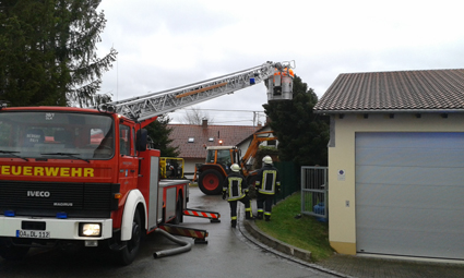 Die Feuerwehrkameraden aus Altusried wurden zum Einsatz wegen des heftigen Sturmes gerufen. Ein großes Trampolin wurde vom Wind erfasst, hing in einem Baum und drohte weiter zu fliegen...