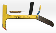 Hier kommt der Glas-Master zum Einsatz, er ist ein Trenngerät, das eigens zum Heraustrennen von Verbundglasscheiben konstruiert ist. Dieses Spezialgerät ist ein Multifunktionswerkzeug und beinhaltet mehrere Werkzeuge. Mit der hammerförmigen Seite des Glasmasters wird zuerst ein Loch in die Scheibe geschlagen, um einen Zugang für das Sägeblatt zu schaffen. Mit dem Sägeblatt kann man