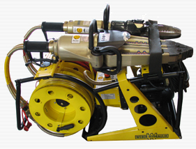 Das integrierte Hydraulik-Aggregat baut den notwendigen Druck von rund 700 bar auf, um mit Schere, Spreizer arbeiten zu können. Werden die Rettungszylinder benötigt, können entweder die nicht mehr gebrauchten Werkzeuge (Schere, Spreizer) abgekuppelt werden und die Zylinder angeschlossen werden, oder sie werden an das zweite Aggregat angekuppelt. An der elektrisch betriebenen Motorpumpe ist eine Schnellangriffshaspel mit 2 x 20 m Hochdruckschlauchpaaren und Kupplungen, für wechselseitigen oder gleichzeitigen Betrieb von 2 Geräten, angebaut. Beide Haspeln arbeiten unabhängig voneinander und sind auch unter Druck abziehbar.