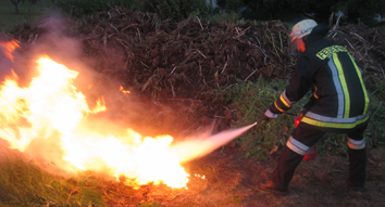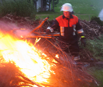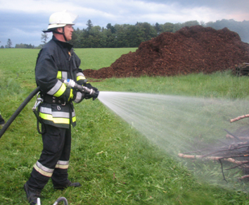 Am Schluss wurden die letzten Glutnester mit dem neuen Hohlstrahlrohr ab- gelöscht. Es kann sehr flexibel eingestellt werden, zum einen im Wasserverbrauch und zum anderen im Sprühkegel.