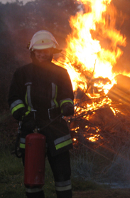 Die Übung fand bei den Gewächshäusern eines Feuerwehrkameradens statt. Hier fand sich genügend Reisig für ein kleines Feuer und genügend Abstand zu benachbarten Gebäuden.