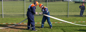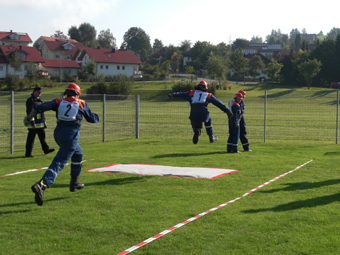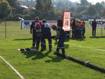 Auf dem Programm standen verschiedene feuerwehrtechnische Aufgaben wie eine Saugleitung und C-Schläuche kuppeln, Seilbeutel auswerfen und Schläuche in der Markierung ausrollen. Weiter mussten die Jugendlichen verschiedene Knoten und Stiche fertigen, durch einen Tunnel kriechen und einen fiktiven Wassergraben überspringen. |