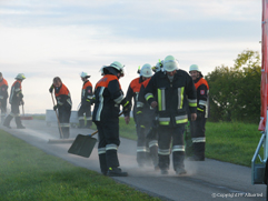 Die Feuerwehrmänner rückten nach “ungewohntem” Anfahrtsweg zum Feuerwehrhaus mit 2 Fahrzeugen und dem neuen Anhänger, beladen mit Ölbindemittel und Streuwagen, aus. Die durch Motoröl verursachte Ölspur zog sich ungefähr 200 m und konnte rasch mit Bindemittel gebunden werden.