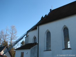 Vom Sturm herausgerissene Kirchdachziegel mussten, wegen der großen Höhe, mit Hilfe der Feuerwehr Altusried wieder eingesetzt werden.