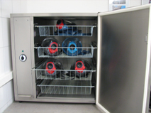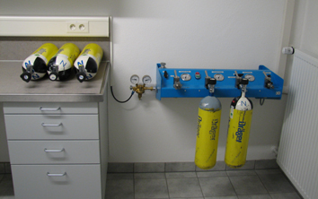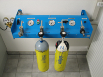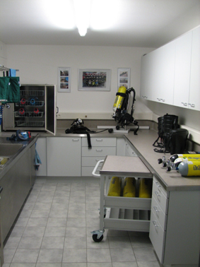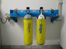 Die leeren Atemschutzflaschen werden mit dem eigenen Atemluftkompressor gefüllt. An der Leiste befinden sich Anschlüsse für drei, 300 bar Flaschen und ein Anschluss für 200 bar Pressluftflaschen. Hier befindet sich auch der Druckminderer für die “Arbeitsluft” im Reinigungsbereich.