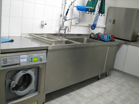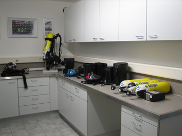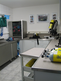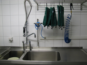 Am Waschbecken mit flexibler Brause befindet sich eine Wartungseinheit, die zur Desinfizierung der Lungenautomaten benötigt wird. Die Luft zur Reinigung und Wartung der Lungenautomaten kommt vom Atemluftkompressor. Über einen Druckminderer wird die “Arbeitsluft” von 300 bar Druck auf 5 bar reduziert. Es können bis zu 7 Lungenautomaten gleichzeitig angeschlossen und desinfiziert werden. Die Lungenautomaten müssen deshalb unter Druck gereinigt und desinfiziert werden, damit keine Flüssigkeit in den Atembereich des Automaten gelangen kann. So wird verhindert, dass Desinfektionsmittel vom nächsten Atemschutzgeräteträger eingeatmet wird.